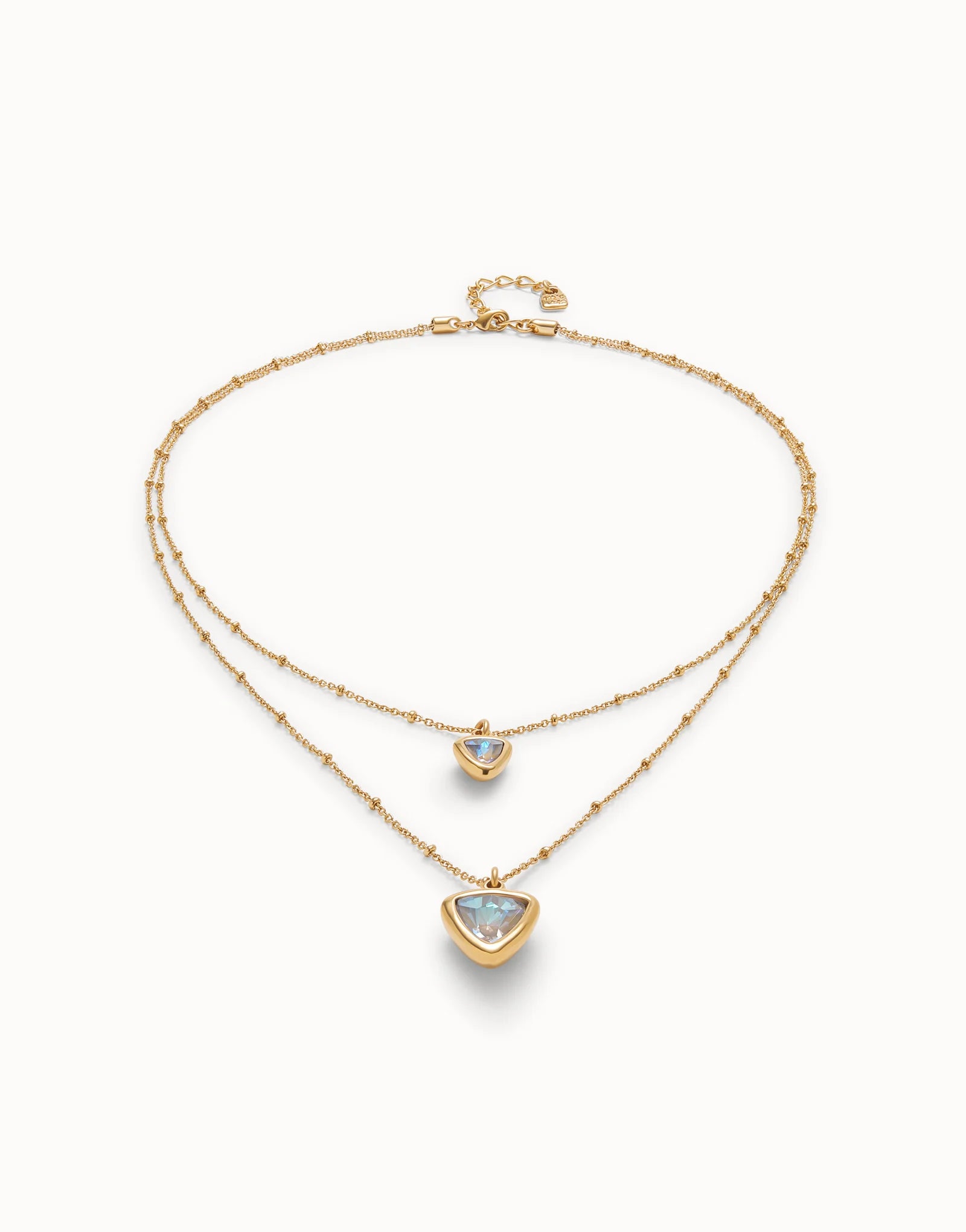 18k gold-plated pendant with double chain and central crystal triangles.Ser camaleónica is to adapt to everything with talent, while still being you. Is being versatile, resilient and always ready to reinvent yourself. Let your jewelry become a kaleidoscopic and change color. Nobody gets bored with you. Bring fun and dynamism to life. Like the fresh touch of the faceted crystal pieces that play with dimensions. The time to Ser camaleónica is now.
