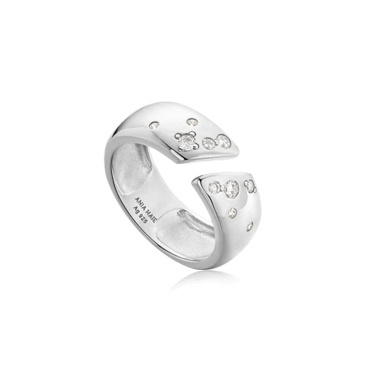 Add dimension and sparkle to your ring stacks with this chunky silver statement ring that nods to modern art. Finished with a sprinkle of sparkling cubic zirconia stones, the open-front ring is adjustable for the perfect fit, ideal for mixing and matching for different looks. Crafted in rhodium-plated sterling silver.