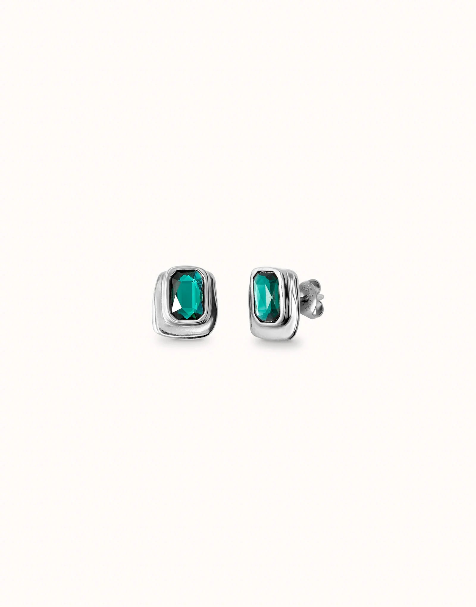 Rectangular sterling silver-plated earrings with faceted green crystal. Made in Spain with a 100% handmade process.These pieces of jewelry are an art exhibition composed of bracelets, rings, necklaces and earrings, where each piece is a work of art in which we find emerald style cut crystals and pieces with layers of geometric shapes. Discover the collection ser magnética.